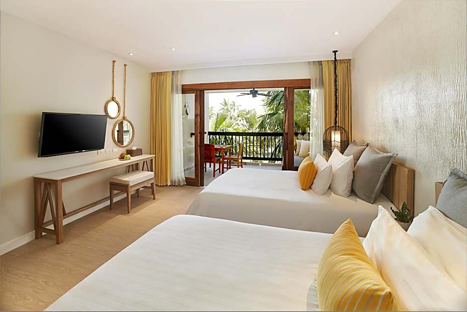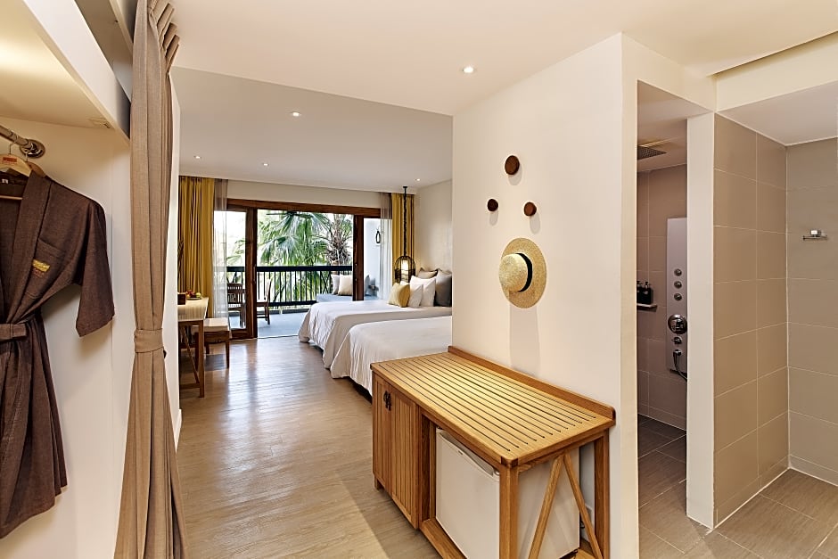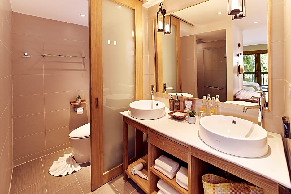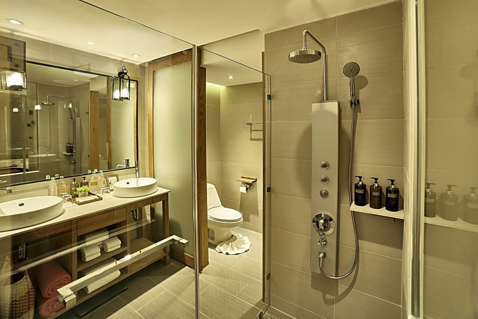 Offering both privacy and fun, this family room comes with a separate kid's area with bunk bed and a playing area directly access to a lawn and kid's swimming pool. Divided by a sliding partition, the parent's zone features a king-size bed with an private bathroom equipped with double shower heads and sinks. Please note that this room type cannot accommodate an extra bed. Children over 11 years of age are not allowed in this room type.